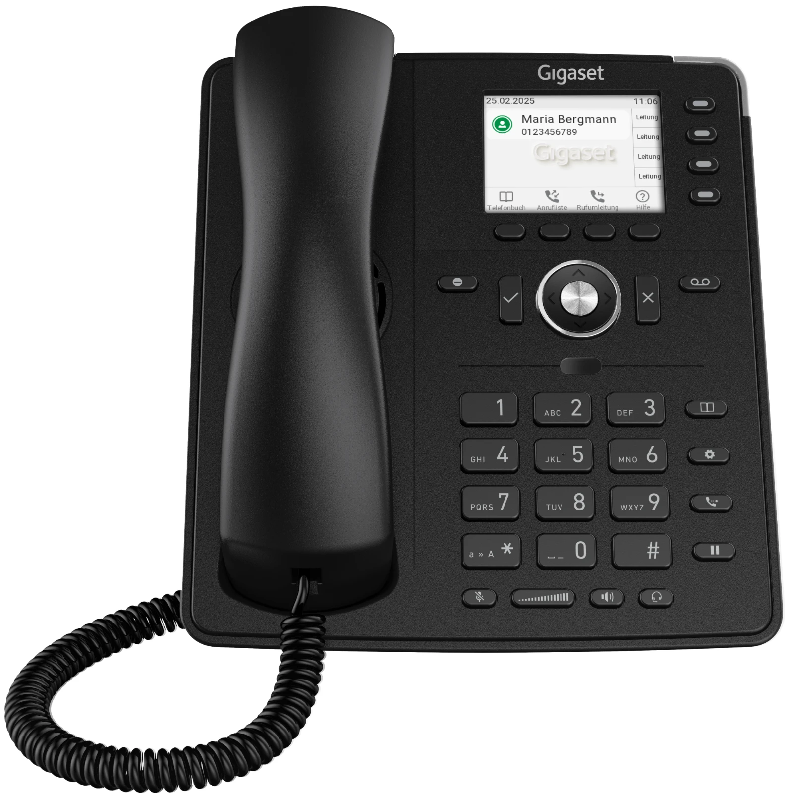 Das Gigaset DESK 600 verfügt über ein dreizeiliges LC-Display mit LED-Hintergrundbeleuchtung, das Rufnummer, Name,Gesprächszeit und VIP-Status (sofern zugeteilt) des Anrufers anzeigt. Der Startbildschirm informiert zudem über das Datum, die Uhrzeit und den Wochentag.